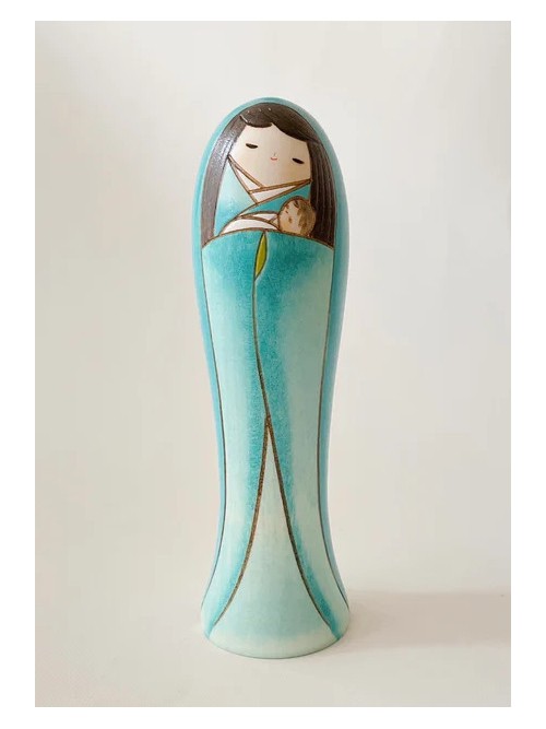 Elle est vêtue d'une robe bleue simple et élégante, ses traits sont fins et son visage délicatement peint exprime une sérénité apaisante. Elle tient Jésus dans ses bras, ajoutant une touche symbolique de chaleur et d'attention.
