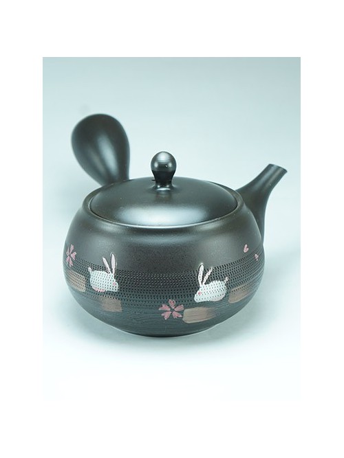 Usagi Sakura est une belle théière en céramique noire à l'esprit zen et décorée de lapins blancs, usagi en japonais, et de fines fleurs de cerisiers roses, les fameuses sakura.